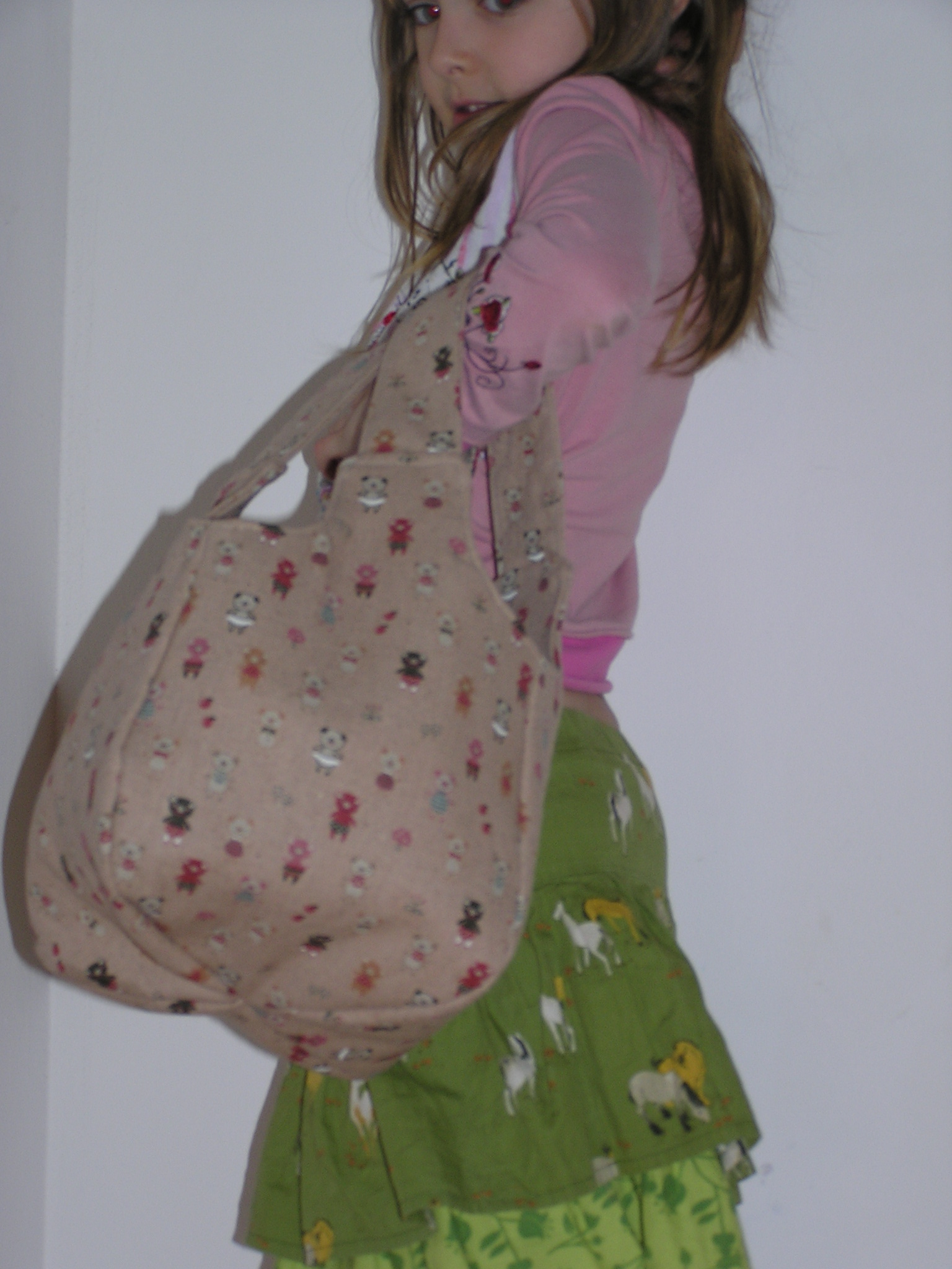 I would like to show you also a handbag I made for a friend as a Christmas´ gift for her daughter, because I was very happy about the result: it´s like a tote, but the shape at the bottom is squared, living a lot of space inside to carry all the important things a 5 years old girl needs when going out 😉 The pattern was designed by myself, inspired in a Japanese bag I saw once in a magazine.