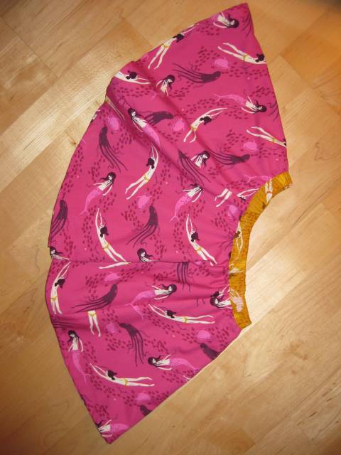 It´s so nice to make yourself the gifts! It turns to be something very special, not only for the love behind the whole care about it, but also because you can make it according to the exact taste of the person that you wish to give the gift to. This year I made 4 skirts, 2 for my daugthers, 2 for my nieces. One of my nieces love mermaids, and when I saw this collection of fabrics I thought immediatelly about her and the idea for the skirts came to my mind: the wave moviment of the water goes so well with the skirt´s shape. I had only 1 day (and night! until 3:00 o´clock in the morning I seat sewing on the 23/12) and a half, on 24/12, 14:00 o´clock I was ready with them all, and this was how they look like: